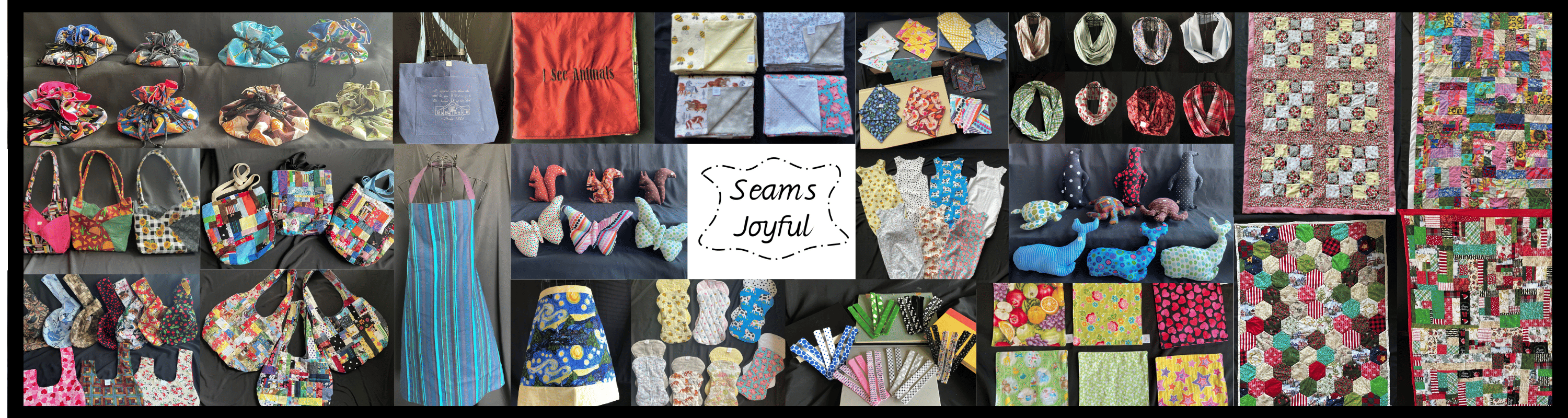 Seams Joyful was started in 2016 and specializes in unique, single-production fabric creations. At Seams Joyful you can find children's toys and games, baby items (blankets, bibs, burp cloths), kitchen items (aprons, oven mitts, mug rugs), lap quilts, a variety of bags (totes, purses, wallets, messenger bags), and more.